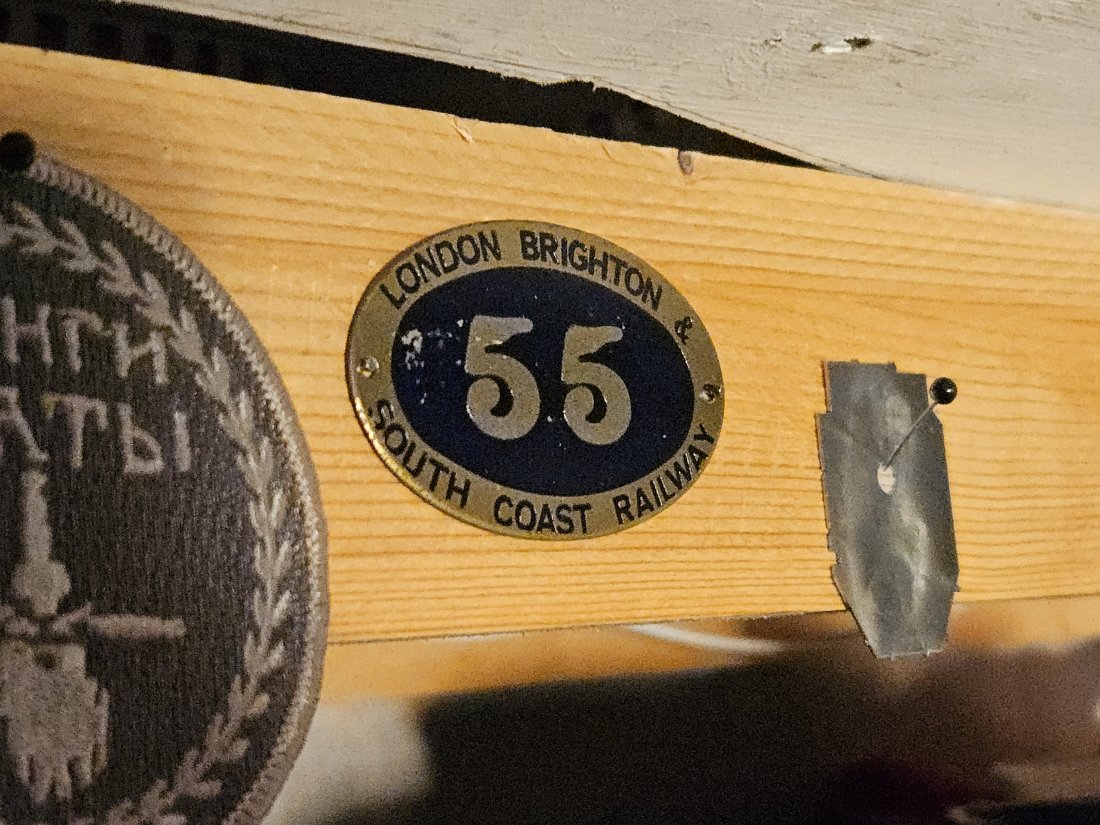Ovale, la plaque est en laiton gravé ou photogravé, et présente un gros « 55 », entouré de l’indication « London, Brighton and South Coast Railway ». Les parties noires ont été brunies chimiquement. J’ai passé quelques années avec cette plaque affichée dans mon bureau, sans savoir à quoi elle correspondait, ni, j’admets, sans vraiment chercher. « Un jour, cela fera un beau projet de réseau » me disais-je.